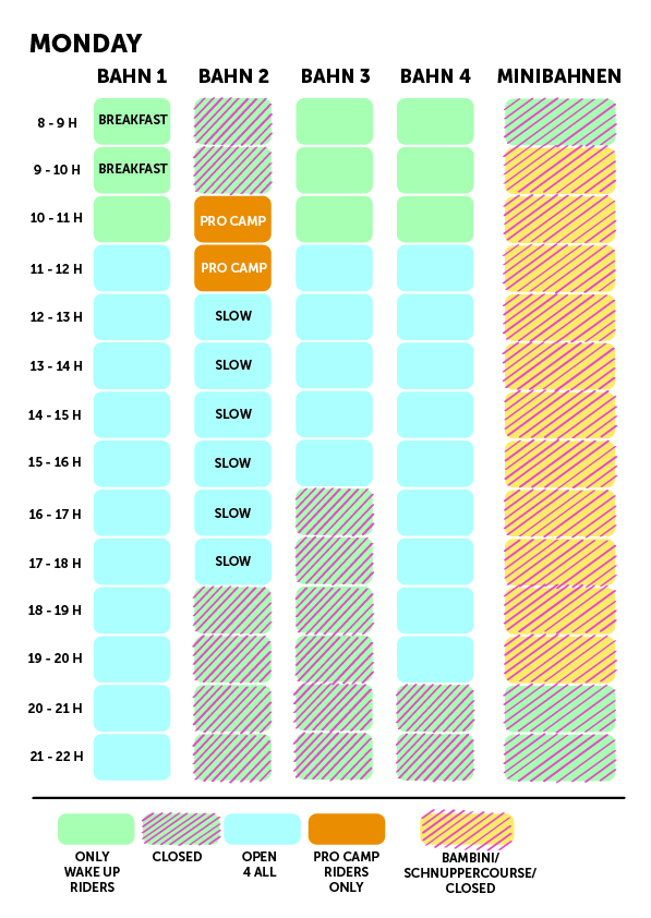 Freut Euch auf lockere Atmosphäre über das ganze Wochenende hinweg. Das Wake Up Camp beginnt Freitags gewohnt mit allen geöffneten Fullsize-Bahnen und einem Live Konzert am Abend. Sucht Euch einen schönen Platz auf einem unserer 4 Campingareas.